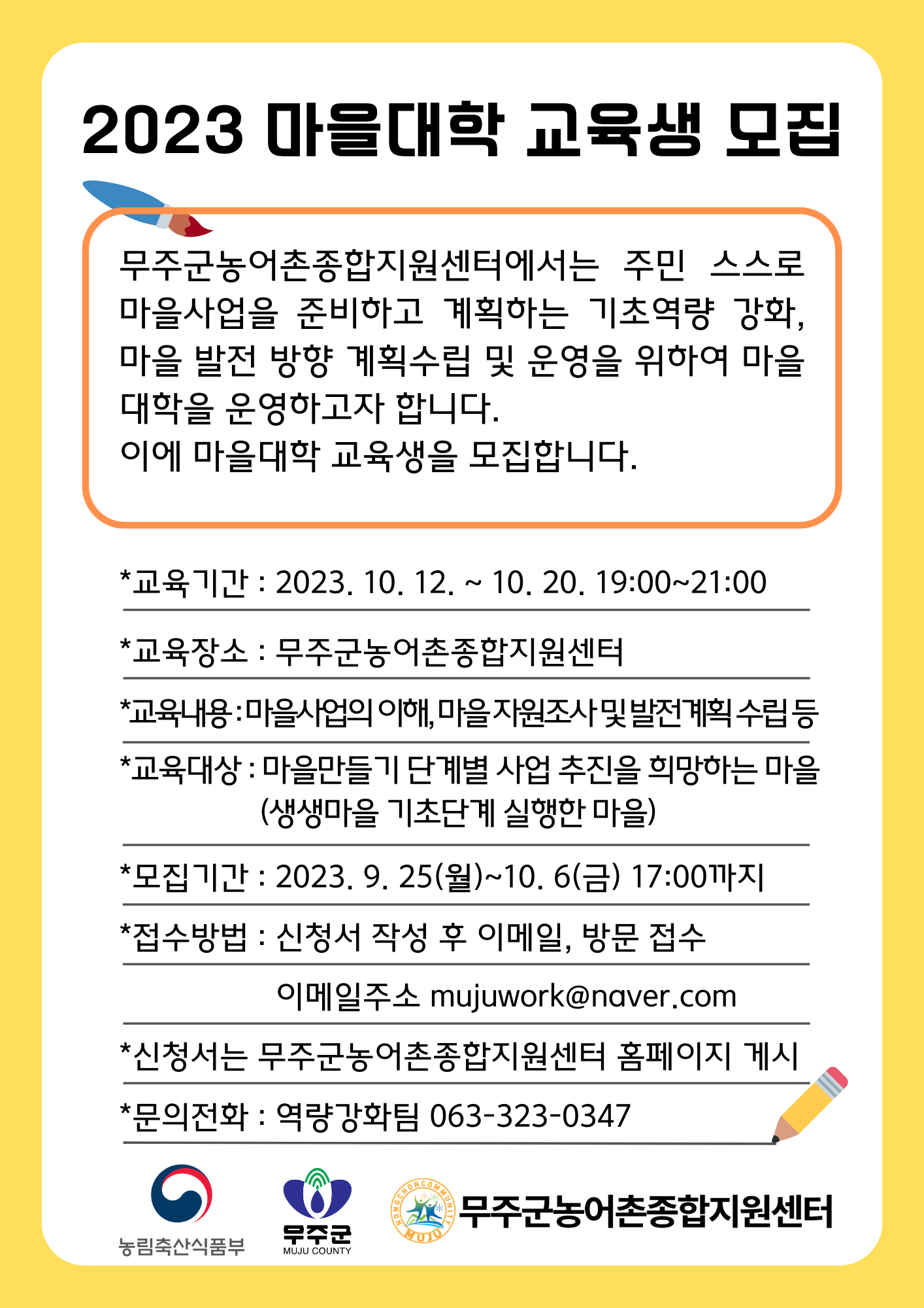 8. 문의전화 : 무주군농어촌종합지원센터 역량강화팀(TEL : 063–323-0347)